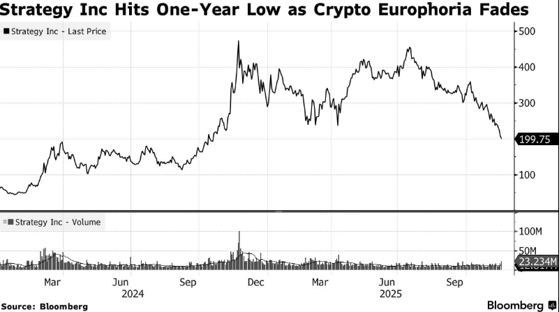 数字资产领域购买停滞的最鲜明例证之一,当属迈克尔·塞勒 (Michael Saylor) 的公司 Strategy Inc.。这家从软件企业转型为比特币储藏的机构,曾是企业财资配置加密资产的典范,如今其股价正徘徊于所持比特币价值的平价水平——这表明投资者不再愿意为塞勒的高杠杆信念模型支付溢价。