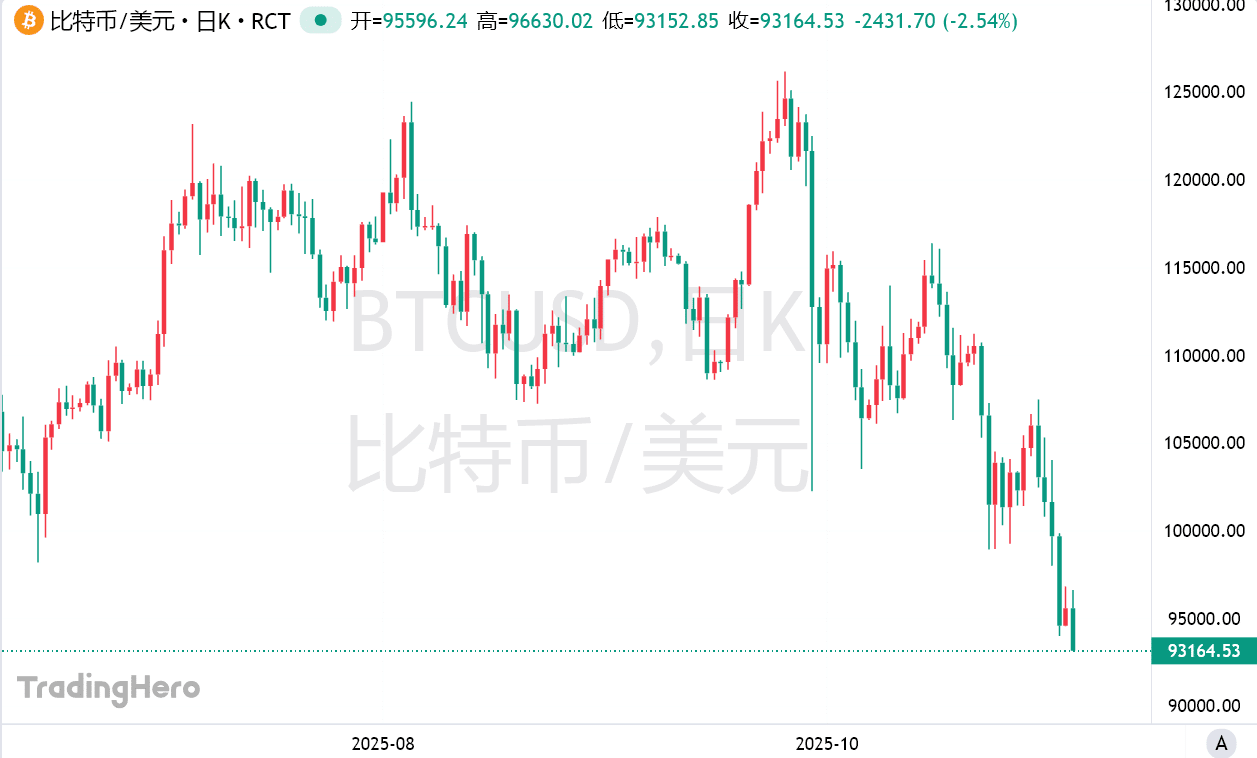 这款主导市场的加密货币上周日跌穿 93714 美元关口,价格已低于去年末收盘水平——当时特朗普胜选推动金融市场全线走高。比特币曾在 10 月 6 日飙升至 126251 美元的历史峰值,但四天后因特朗普出人意料的关税言论引发全球市场震荡,币价随即开启跌势。