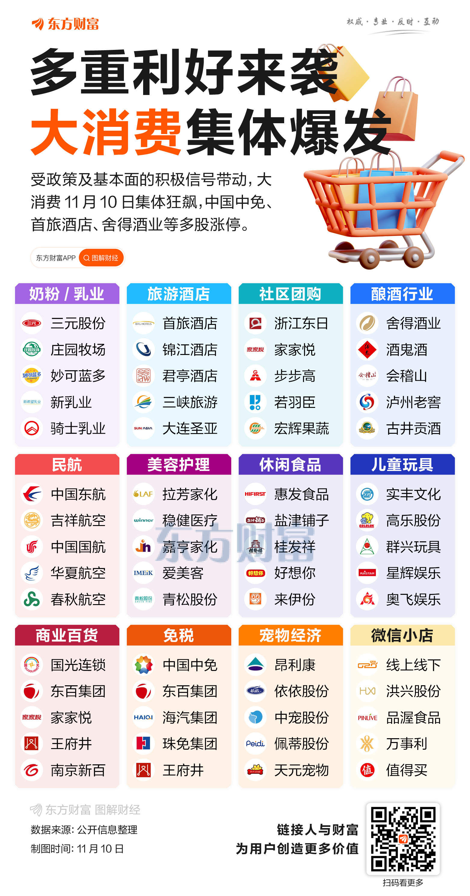 从新兴消费看,数字消费和绿色消费持续壮大,有力促进消费增长。1~10 月份,全国网上零售额同比增长 9.6%,即时零售交易额和直播电商交易额均保持两位数增长。此外,我国正处在消费结构升级的关键阶段,文化旅游、医疗健康等消费空间广阔,银发经济、首发经济等快速发展,也为消费扩大注入新动能。
