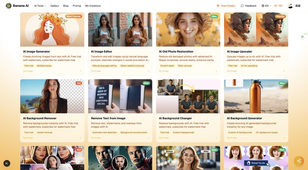 这个平台集成了目前最先进的 AI 技术,功能覆盖了图像编辑的方方面面,能帮助你一键完成各种处理任务,提升你的工作效率和创作速度。无论你是电商运营、自媒体创作者、设计师,还是摄影师,AI Banana 都能成为你的得力助手。