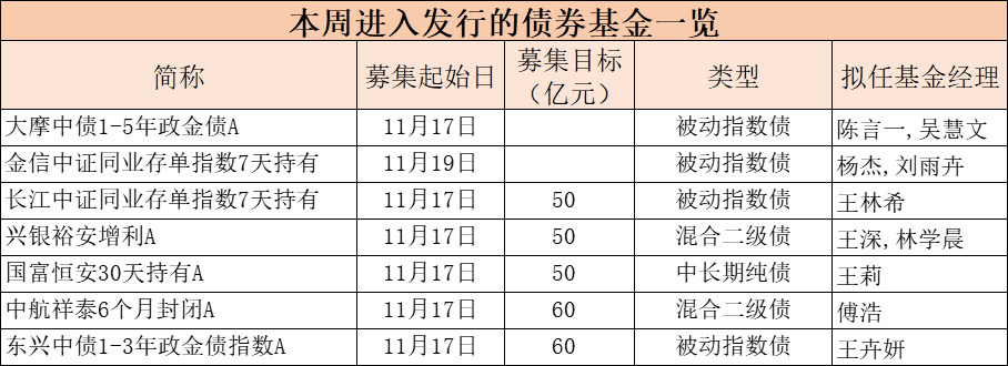 具体来看,周一 (11 月 17 日) 本周 33 只新发基金中 26 只扎堆在周一开始发行,占本周新基金的 78.79%;周二有 1 只新基金启动募集,周三有 6 只基金开始认购。