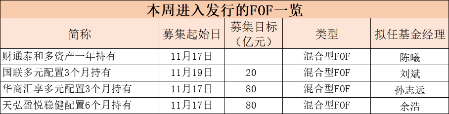 此外,本周有 4 只混合型 FOF 产品集体上架。今年以来,随着权益市场企稳回升、投资者信心逐步恢复,FOF 也明显回暖,Wind 数据显示,截至 10 月 31 日,全市场成立满 6 个月的 477 只 FOF 年内收益均为正,且平均收益率达 14.29%。