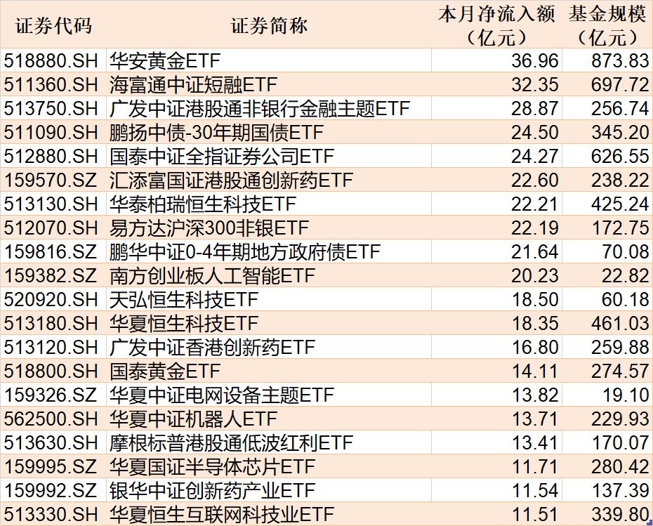 Wind 数据显示,在 11 月 14 日的非货币 ETF 市场中,海富通中证短融 ETF 基金份额增加 0.10 亿份,净流入额为 11.36 亿元;华夏恒生互联网科技业 ETF 基金份额增加 18.90 亿份,净流入额为 10.39 亿元;南方创业板人工智能 ETF 基金份额增加 5.08 亿份,净流入额为 8.99 亿元。