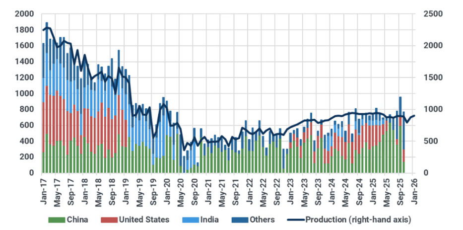 根据 OPEC 上周三发布的月度石油报告,委内瑞拉产量从 2024 年的约 86.7 万桶/日小幅上升至今年第三季度的约 94.5 万桶/日。然而,美国能源信息署 (EIA) 数据显示,与五年前估计的 320 万桶/日相比,这大约下降了 70%。相比之下,OPEC 最大石油出口国沙特第三季度石油产量为 970.5 万桶/日。