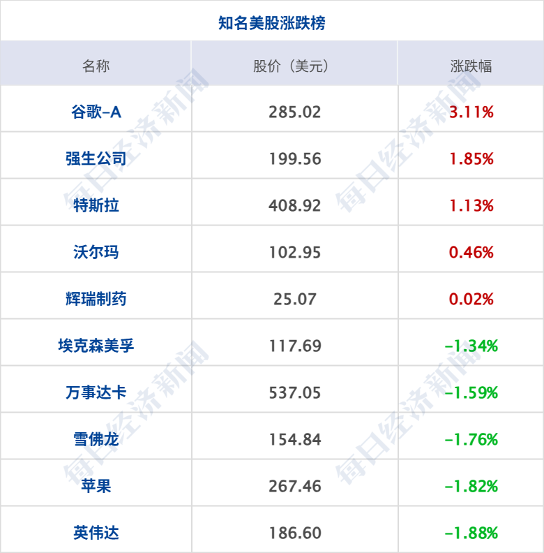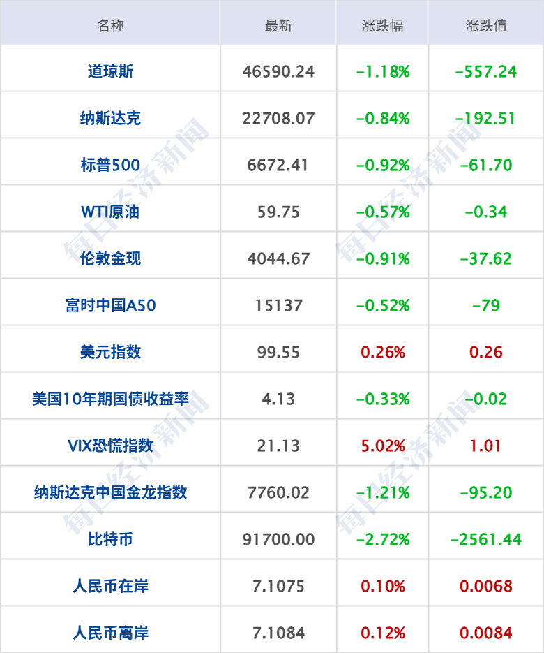 美股三大指数集体收跌,道指跌 557 点,跌幅 1.18%,标普 500 指数跌 0.92%,纳斯达克综合指数跌 0.84%;大型科技股多数下跌,AMD、英特尔跌超 2%,英伟达、苹果、甲骨文、Meta 跌超 1%,谷歌逆势涨超 3%;黄金矿业股普跌,赫克拉矿业跌超 4%,金田、哈莫尼黄金跌超 3%;加密货币概念股走弱,Coinbase 跌超 7%,Circle 跌超 6%。中概股多数下跌,纳斯达克中国金龙指数跌 1.21%,小鹏汽车跌超 10%,理想汽车跌超 4%,网易、百度、蔚来跌超 1%,阿里巴巴涨超 2%。