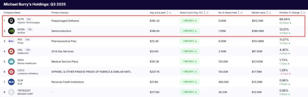 本月初,华尔街知名 「空头」 迈克尔·伯里披露了对英伟达的大量空头头寸,迈克尔·伯里旗下对冲基金 Scion Asset Management 披露的第三季度持仓报告显示,该基金持有价值约 9.12 亿美元的 500 万股 Palantir 看跌期权和价值约 1.87 亿美元的 100 万股英伟达看跌期权 (占其资产总值的 80%)。