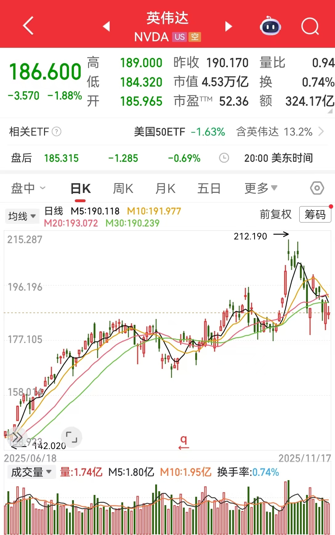 截至 11 月 17 日美股收盘,英伟达股价报 186.6 美元,较前一交易日下跌 1.88%。公司市值为 4.53 万亿美元。值得注意的是,与 10 月 29 日的近期高点相比 (当日股价为 212.19 美元),英伟达市值在短短 14 个交易日蒸发了 6218 亿美元,约合人民币 4.42 万亿元。
