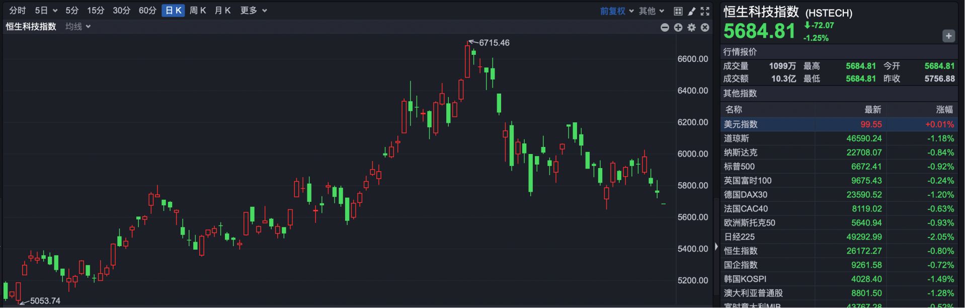 恒生科技指数报 5684.81 点,下跌 72.07 点,跌幅 1.25%。