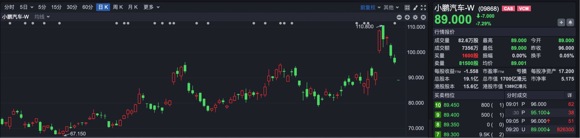 重要公司方面,小鹏汽车 (09868.HK) 早盘跌超 7%。公司昨日发布公告,第三季度总收入为人民币 203.8 亿元,按年增加 101.8%。第三季度小鹏汽车普通股股东应占净亏损为人民币 3.8 亿元 (0.5 亿美元),2024 年同期为人民币 18.1 亿元。