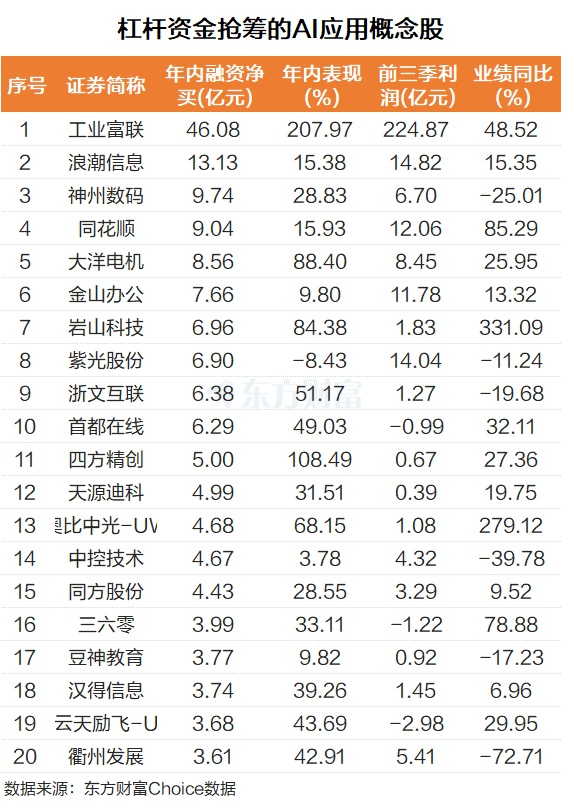 今年以来,虽然科技股热潮主要集中在硬件方向,但软件方向 (AI 应用) 同样可圈可点。从杠杆资金角度来看,工业富联在年内被融资净买入 46.08 亿元,该股年内大涨 207.97%。浪潮信息紧随其后,被融资净买入 13.13 亿元。神州数码第三位,年内被融资净买入 9.74 亿元。
