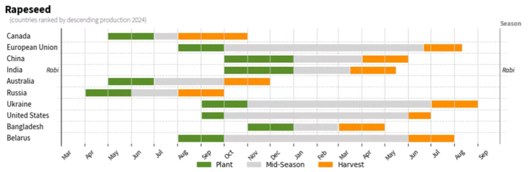 今年的弱拉尼娜现象预计持续至明年 2 月,当前加拿大、俄罗斯、澳洲菜籽已收获完毕,乌克兰及欧盟菜籽处于生长期。