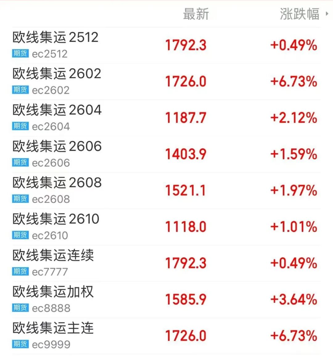 昨日,集运指数 (欧线) 期货 (下称集运指数) 表现偏强,主力 2602 合约收盘大涨 6.73%。