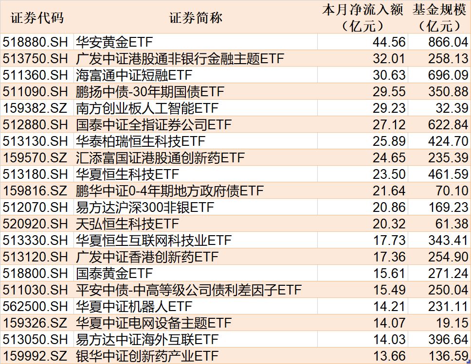 截至 11 月 17 日,本月资金净流入额居前 20 的 ETF 名单如下: