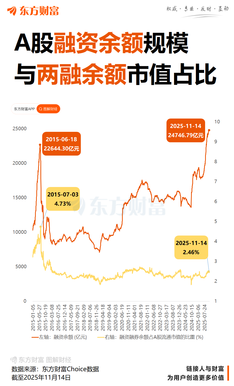 数据显示,下半年以来 (7 月 1 日以来,下同),A 股融资余额不断攀升,10 月 29 日创下历史新高 24885.78 亿元。融资余额最新值为 24746.99 亿元 (截至 11 月 14 日),处于近 15 年高位。相较上半年末的 18381.49 亿元增长 6365.5 亿元,增幅 34.63%。