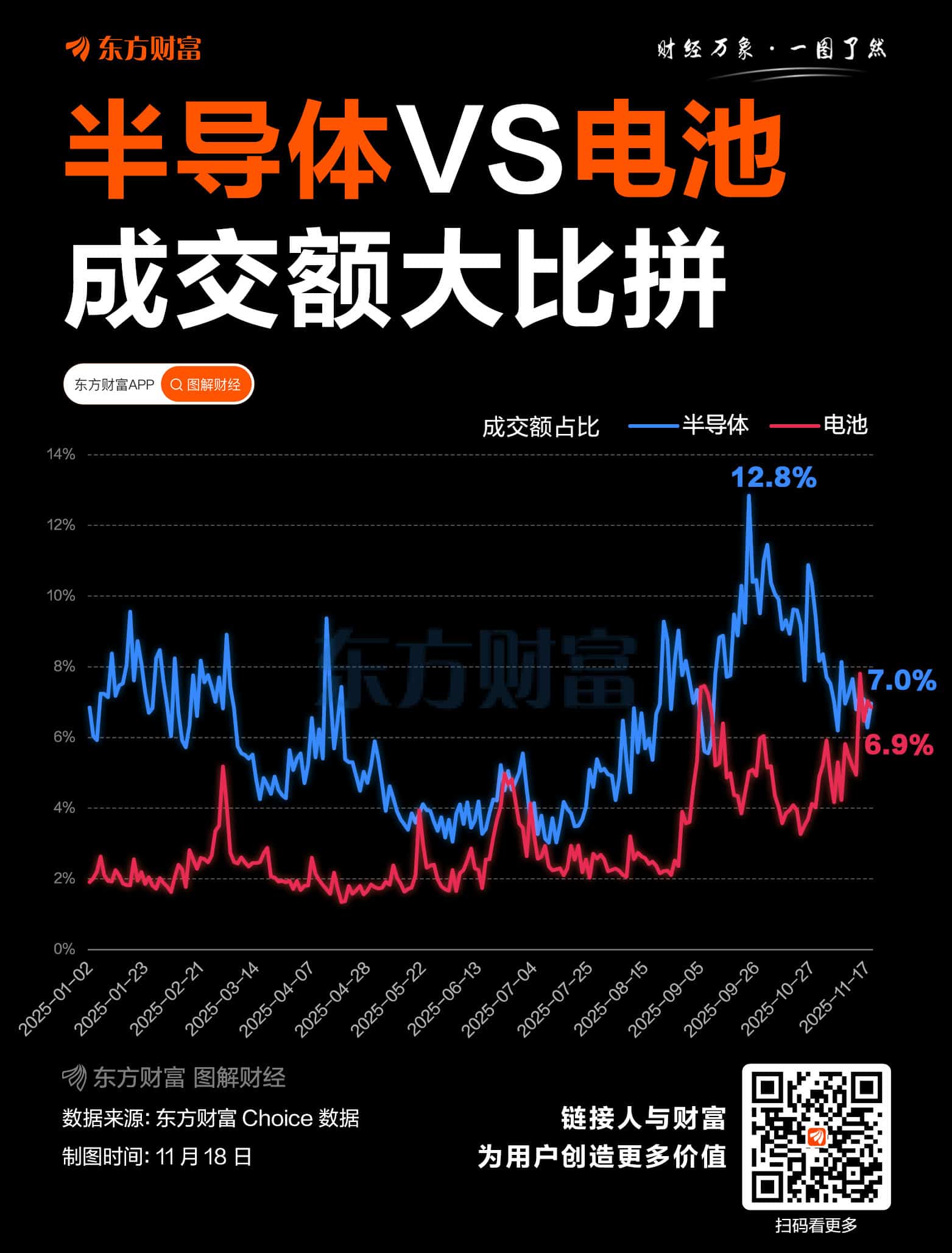 近日大火的电池板块今日迎来调整,收跌 3.56%,而半导体板块则逆势走强,收涨 0.74%。而且,半导体板块的成交额也重新超过电池。