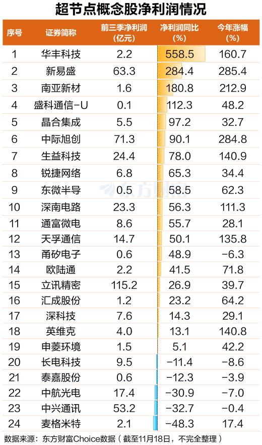 从超节点产业链公司的业绩情况看,今年整体表现亮眼,业绩大增的个股不在少数。据东方财富Choice 数据,超节点概念股今年前三季度净利润多数同比增长 (不完全整理),其中华丰科技、新易盛、南亚新材、盛科通信-U等增速居前,均超 100%;晶合集成、中际旭创、生益科技、锐捷网络等 8 股,增速均超 50%。