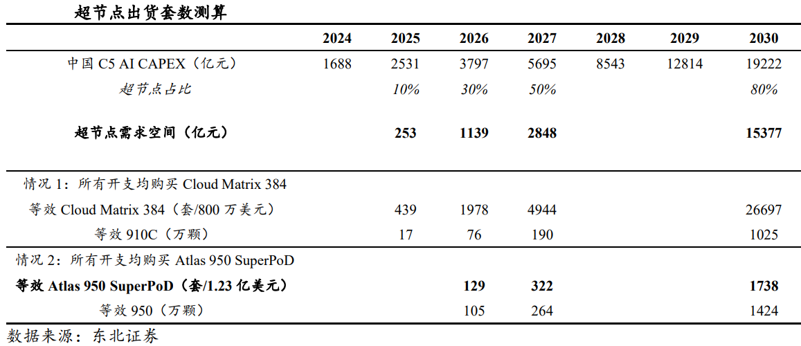 预计中国互联网 C5(阿里巴巴、字节跳动、腾讯、美团及百度)AI 基础设施资本开支将从 1688 亿元增长至 1.92 万亿元。超节点作为高密度算力部署的核心基础设施,其在 C5 资本开支中的占比将随时间快速提升,假设该占比从 2025 年的 10% 上升至 2030 年的约 80%,对应的超节点需求空间将从 2025 年的 253 亿元增至 2030 年的 1.54 万亿元。