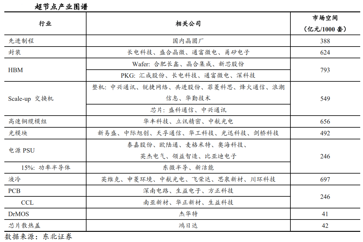 以华为 Atlas950 作为测算标准,假设年出货 1000 套,各环节占比分别为:先进制程晶圆代工约 388 亿元、封装约 624 亿元、HBM 约 793 亿元,Scale-up 交换芯片约 549 亿元,高速铜缆模组约 656 亿元,光模块约 492 亿元,电源约 246 亿元,液冷约 697 亿元,PCB约 246 亿元,DrMOS 约 41 亿元,散热盖约 42 亿元。