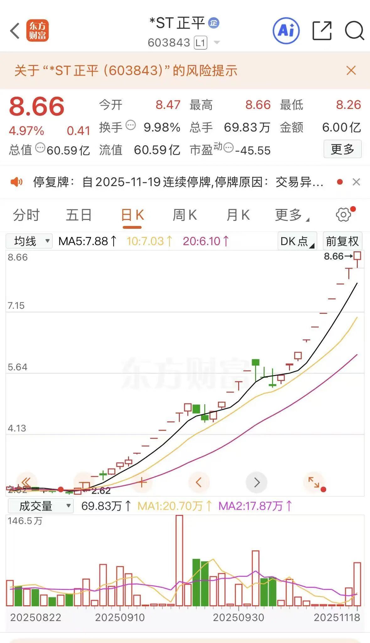 11 月 18 日晚间,*ST 正平 (603843,股价 8.66 元,市值 60.59 亿元) 公告称,公司股票自 2025 年 9 月 1 日至 11 月 18 日累计涨幅达 221.93%,股价短期涨幅与同期上证指数、建筑行业存在严重偏离,已严重脱离基本面。