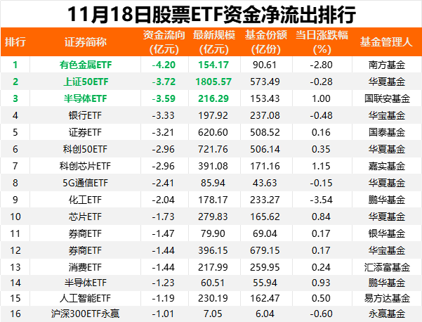 从全市场 ETF 来看,11 月 18 日资金净流入 73.8 亿元。从大类型来看,债券 ETF 与港股市场 ETF 净流入居前,分别为 44.92 亿元与 35.17 亿元。