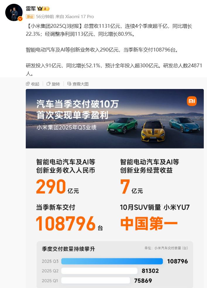 18 日,小米创办人,董事长兼 CEO 雷军在微博发文称,小米集团 2025Q3 总营收 1131 亿元,连续 4 个季度超千亿,同比增长 22.3%;经调整净利润 113 亿元,同比增长 80.9%。