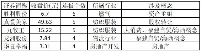 从连板情况来看,今日首板个股有 28 只;2 连板的个股有 8 只;3 连板及以上的个股有 9 只。今日连板数排名前 5 的个股包括胜利股份、真爱美家、九牧王、龙洲股份、华夏幸福,具体如下表所示。