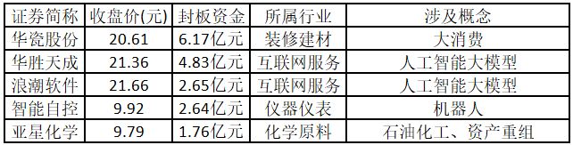从封板资金来看,今日涨停板个股中,封板资金排名前 5 的个股包括华瓷股份、华胜天成、浪潮软件、智能自控、亚星化学。欢迎大家关注微信公众号 「道达号」,其 「道达涨停复盘」 栏目为大家解读。
