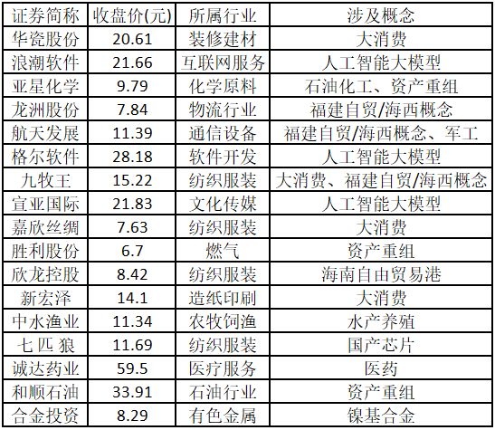 涨停板个股中,股价创出近一年新高的个股有 17 只 (不包括创出历史新高的个股),包括华瓷股份、浪潮软件、亚星化学、龙洲股份、航天发展、格尔软件、九牧王、宣亚国际、嘉欣丝绸、胜利股份、欣龙控股、新宏泽、中水渔业、七匹狼、诚达药业、和顺石油、合金投资,具体如下表所示。