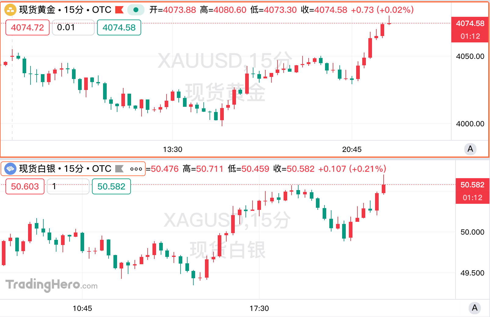 数据公布后,现货黄金一度站上 4080 美元/盎司,现货白银日内涨超 1.00%。