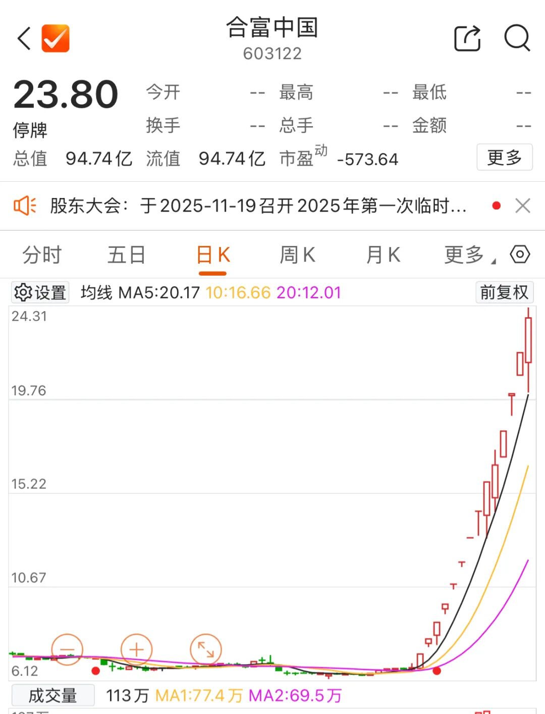截至停牌前最后一个交易日,即 11 月 14 日,合富中国股价报 23.80 元/股,当天涨幅达 7.69%,总市值为 94.74 亿元。