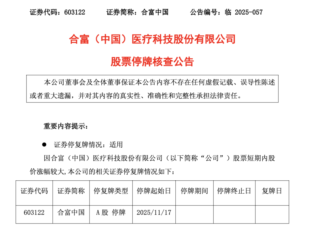 11 月 14 日,合富中国继续大幅上涨,盘中一度触及涨停,换手率高达 28.48%。为维护广大投资者利益,根据相关规定,经向上交所申请,公司股票于 11 月 17 日 (星期一) 开市起停牌。