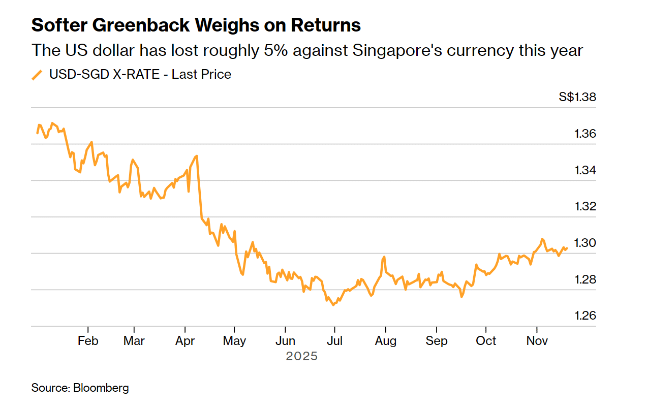 今年以来,彭博美元现货指数已下跌近 7%,美元兑新加坡元也贬值了约 5%。尽管美国仍然是许多大型机构和资产管理公司的首要投资目的地,但美元的下跌已经侵蚀了非美元基准投资者的回报。