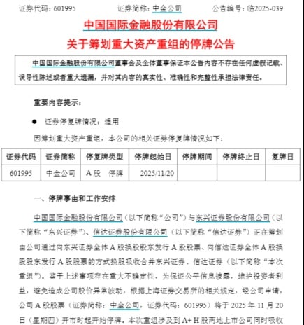 11 月 19 日晚,中金公司、信达证券、东兴证券发布 《关于筹划重大资产重组的停牌公告》,3 家公司正在筹划由中金公司通过向东兴证券全体 A 股换股股东发行 A 股股票、向信达证券全体 A 股换股股东发行 A 股股票的方式换股吸收合并东兴证券、信达证券。