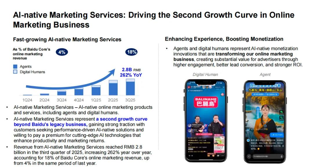 三季度,AI 原生营销服务收入达到 28 亿元人民币,同比强劲增长 262%,占百度核心在线营销收入的 18%。而一年前同期,这个比例还只有 4%。