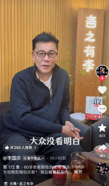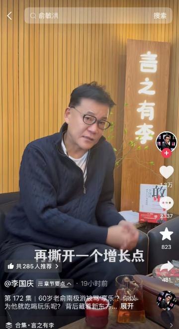 李国庆在视频中称:「你以为老俞就吃喝玩乐呢,新东方 32 周年发个信,他有不可告人的伏笔,员工没看明白,大众没看明白,我看明白了,他想为新东方再撕开一个增长点——文旅。我们说了,要么我们就做 AI 改变世界,要不然就做 AI 改变不了的吃喝玩乐。他在布局文旅,不出三年,他在文旅上也能带着新东方闯出一片天下。」