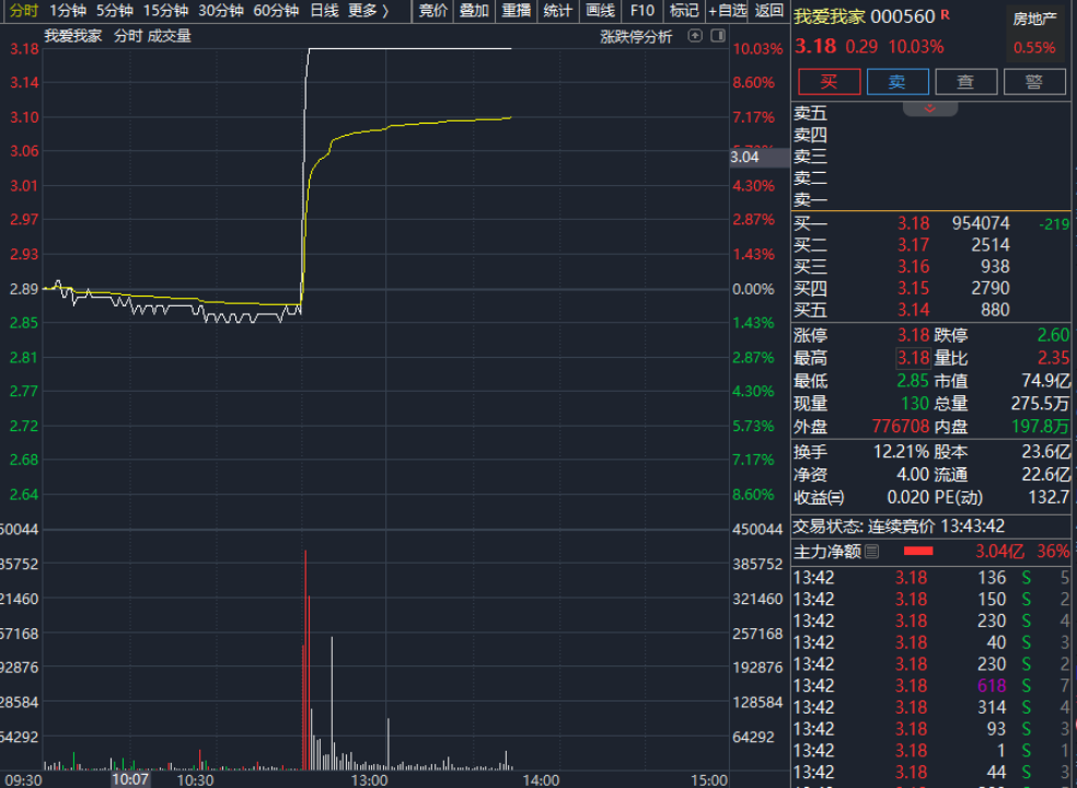 今日上午 11 时左右,A 股地产股大幅拉升,2 分钟的时间,我爱我家的股价从-1% 的位置直线拉升至 10% 涨停。随后,特发服务、世联行、福星股份、光大嘉宝、德必集团集体跟涨,招商蛇口、金地集团、保利发展、万科 A等地产龙头也纷纷跟涨。