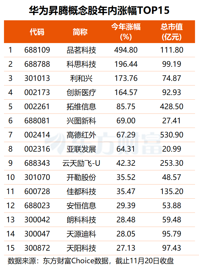东方财富概念板块显示,目前 A 股市场共有 41 股涉及华为昇腾概念,合计总市值约 5788 亿元。华为昇腾概念股年内股价平均上涨 40.35%,近八成个股实现上涨。其中,品茗科技、科思科技、利和兴等 4 股涨幅居前。品茗科技年内股价累计上涨约 495%,公司系建筑行业软件龙头,此前曾携手华为发布联合解决方案。