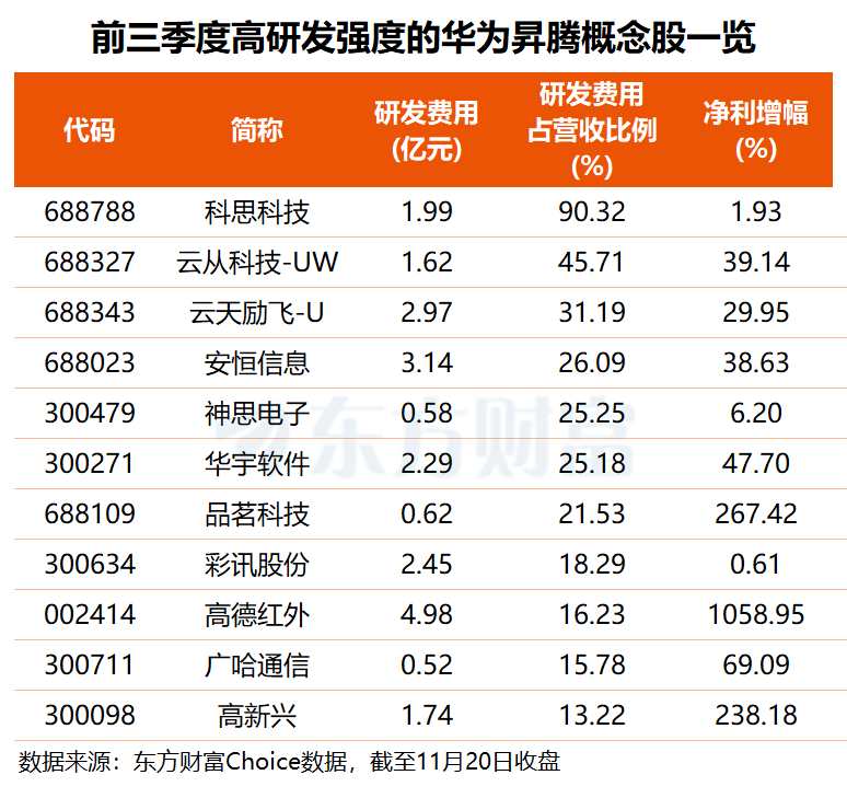研发投入方面,东方财富 Choice 数据显示,今年前三季度研发费用超 5000 万元且净利润实现同比增长或好转的概念股共 19 只,其中,软通动力研发费用达 7.71 亿元居首,高德红外以 4.98 亿元的研发费用位居次席,安恒信息、云天励飞-U、彩讯股份等 4 股的研发费用均超 2 亿元。