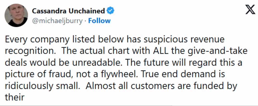 伯里认为,未来的观察者回顾这段时期时,会将当前的 AI 热潮视为欺诈而非变革。他认为 「真实的终端需求少得可笑」,并声称许多推动 AI 增长的客户本身就由向他们销售 AI 技术的公司资助——描绘了一个自我强化的循环,而非可持续的普及应用。