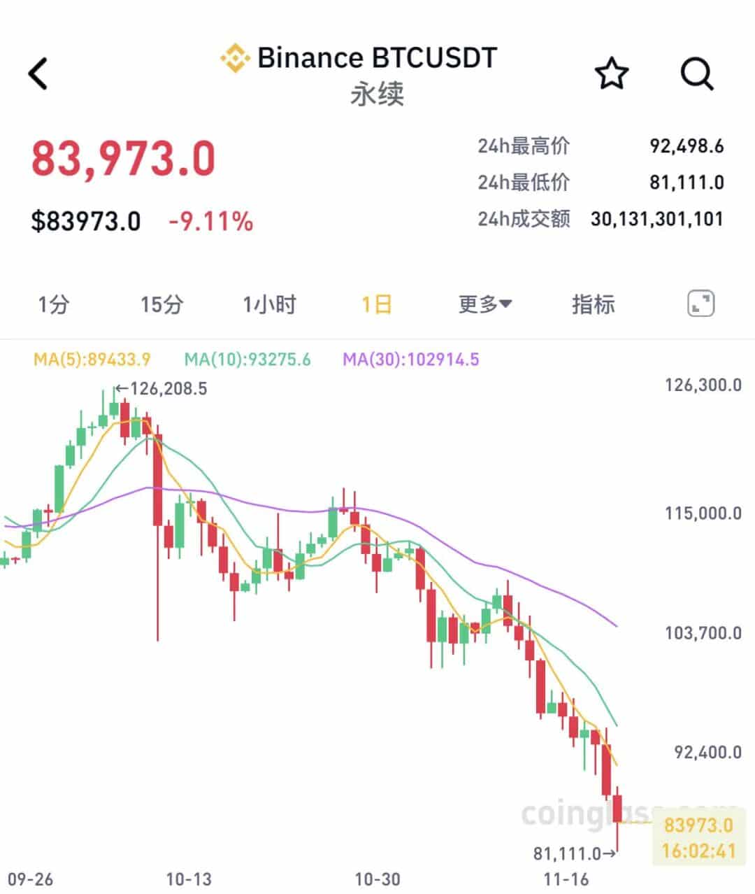11 月 21 日,虚拟货币跌幅不断扩大,盘中再度上演跳水行情。其中,比特币一度跌破 82000 美元关口,最低触及 81111 美元,创 4 月 7 日以来新低,24 小时内最高跌去 11000 美元,随后有所回升。截至发稿,比特币报 83973 美元,跌超 9%。