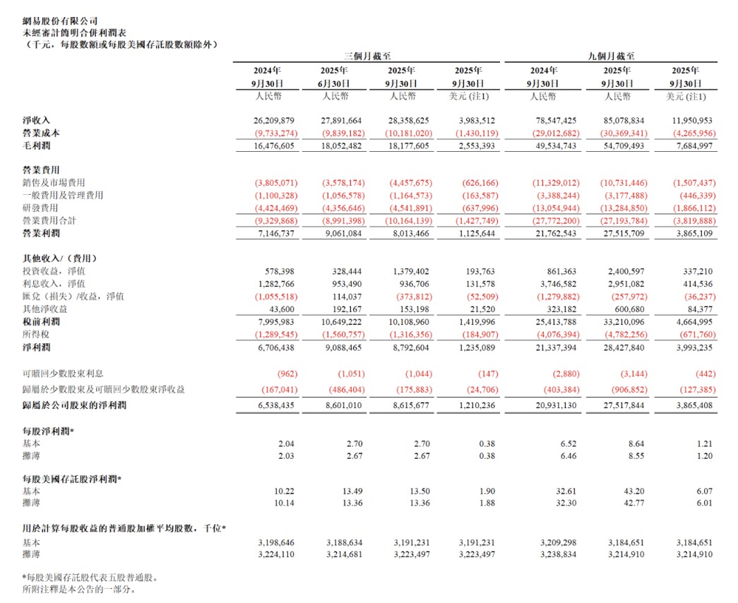 11 月 20 日,网易(09999.HK) 发布 2025 年第三季度财报。财报显示,网易 Q3 净收入 284 亿元,同比增加 8.2%;归股净利润为 86 亿元,同比增长 32%;非公认会计准则下归股净利润为 95 亿元,同比增长 26.7%。