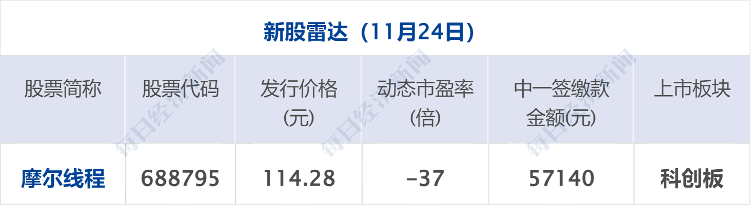 摩尔线程:11 月 24 日,国产 GPU「第一股」 摩尔线程新股申购。根据此前公告,公司本次发行股份数量为 7000 万股,发行价格为 114.28 元/股,预计募集资金总额为 80 亿元,扣除发行费用后,预计募集资金净额为 75.76 亿元。该股将在 2025 年 11 月 24 日进行网上和网下申购。值得注意的是,摩尔线程是今年以来发行价最高的新股,中一签需缴款 57140 元。摩尔线程本次发行后总股本为 4.7 亿股,按 114.28 元/股的发行价计算,上市时总市值将达 537 亿元。