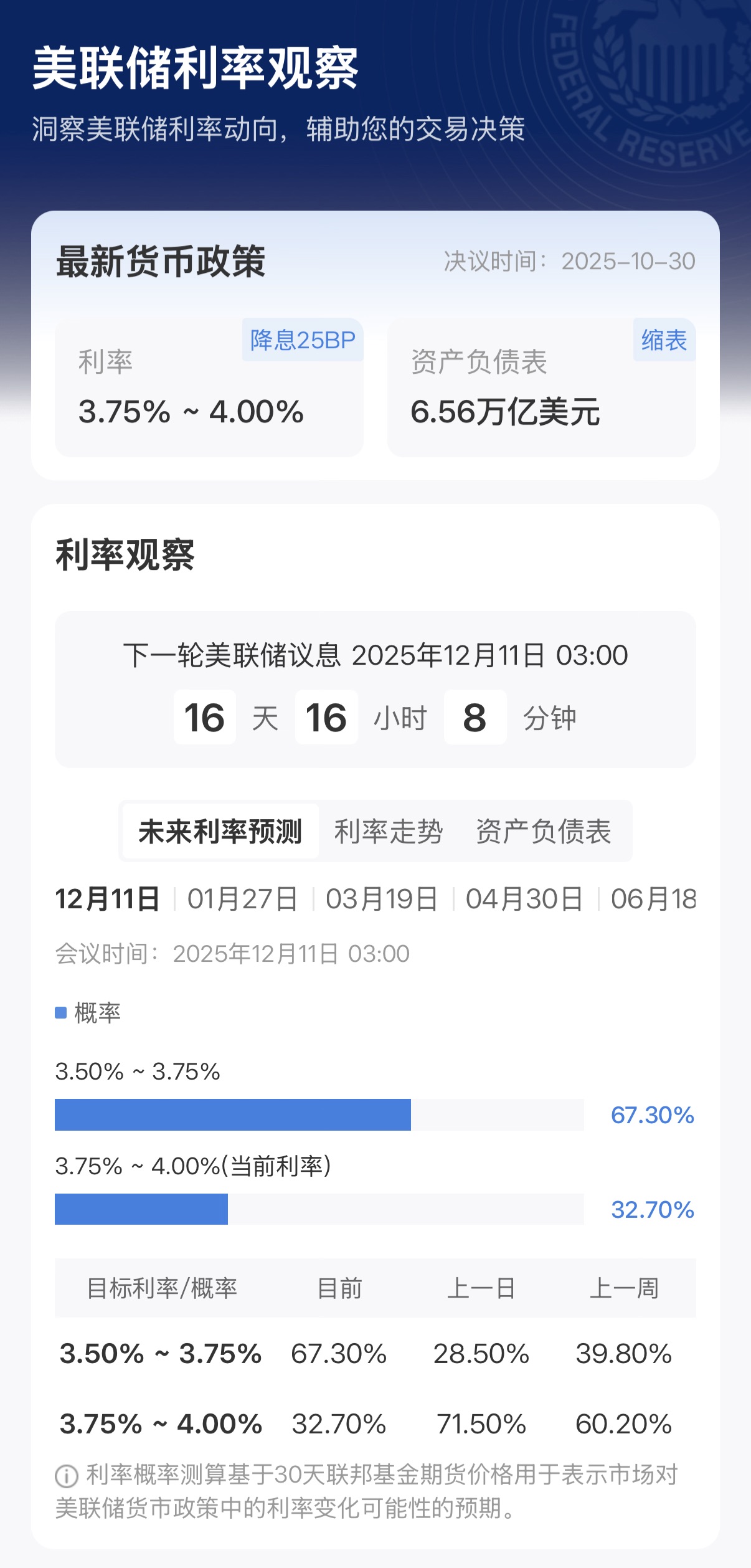 上周四,「迟到 48 天」 的美国 9 月官方就业数据终于出炉,但喜忧参半的结果未能平息关于美联储政策路径的争论。直到纽约联储主席威廉姆斯上周五表示,随着劳动力市场趋弱,近期存在降息空间,这使得 12 月降息概率重新攀升至了 65% 左右。