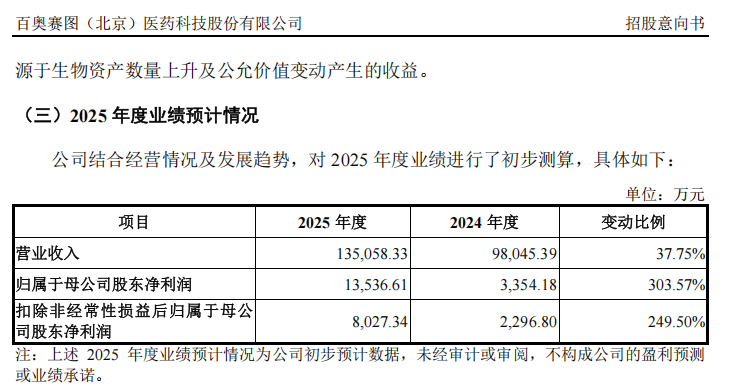 招股意向书显示,基于海外市场开拓和国内生物医药企业释放更多的研发需求,百奥赛图预计其 2025 年全年的营业收入为 13.51 亿元,同比增长 37.75%;归母净利润为 1.35 亿元,同比增长 303.57%。