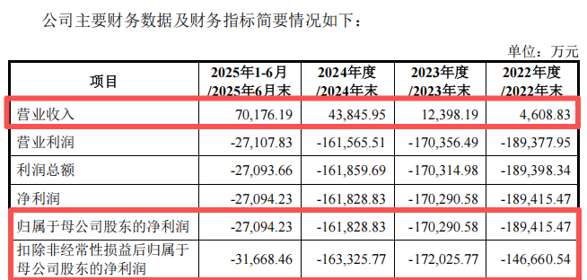 2022 年至 2024 年及 2025 年上半年,摩尔线程的营业收入分别为 4608.83 万元、1.24 亿元、4.38 亿元及 7.02 亿元,归母净利润分别为-18.94 亿元、-17.03 亿元、-16.18 亿元及-2.71 亿元。