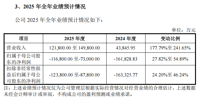 招股意向书显示,受 AI 蓬勃发展及国产化进程加速的影响,摩尔线程预计其 2025 年全年的营业收入为 12.18 亿元至 14.98 亿元,同比增长 177.79% 至 241.65%;归母净利润为-11.68 亿元至-7.30 亿元,同比增长 27.82% 至 54.89%。