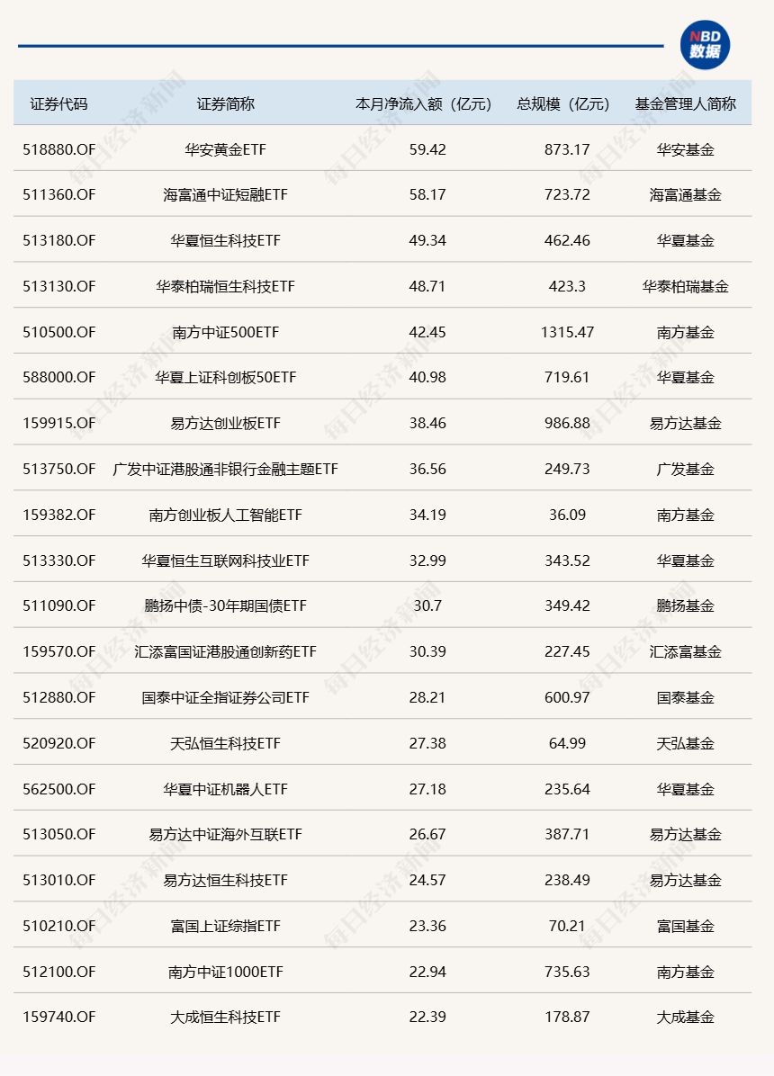 截至 11 月 21 日,本月资金净流入额居前 20 的 ETF 名单如下:
