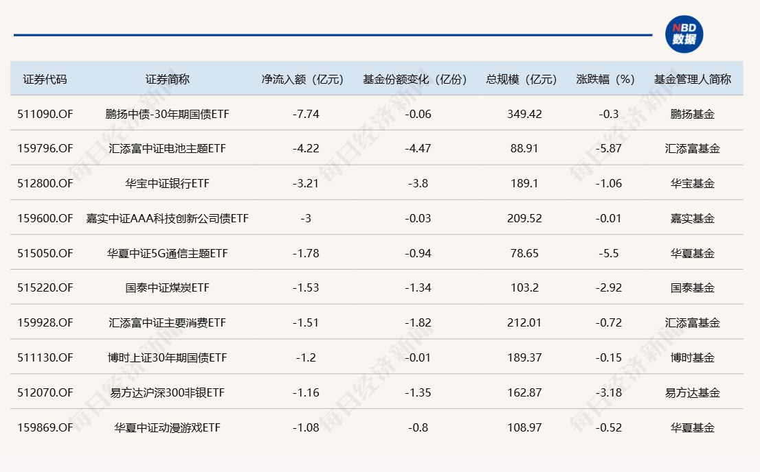 与此同时,鹏扬中债-30 年期国债 ETF 基金份额减少 0.06 亿份,对应资金净流出 7.74 亿元;汇添富中证电池主题 ETF 份额减少 4.47 亿份,出现净流出 4.22 亿元;华宝中证银行 ETF 份额减少 3.80 亿份,录得净流出 3.21 亿元。