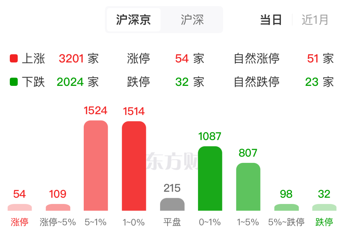 量能方面,两市半天成交 1.02 万亿元,较上一交易日同期大幅缩量约 2807 亿元;早盘全市场共 3201 股飘红,54 股涨停。