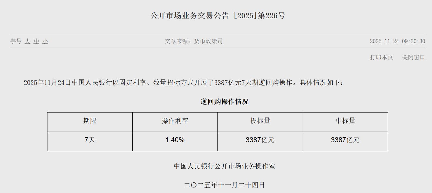 11 月 24 日,央行公告,为保持银行体系流动性充裕,2025 年 11 月 25 日,中国人民银行将以固定数量、利率招标、多重价位中标方式开展 10000 亿元 MLF 操作,期限为 1 年期。